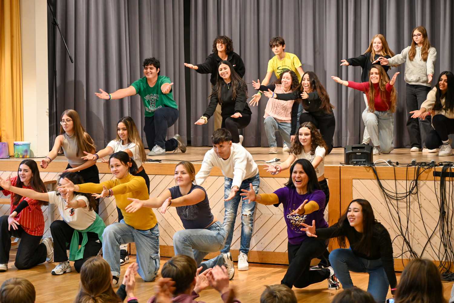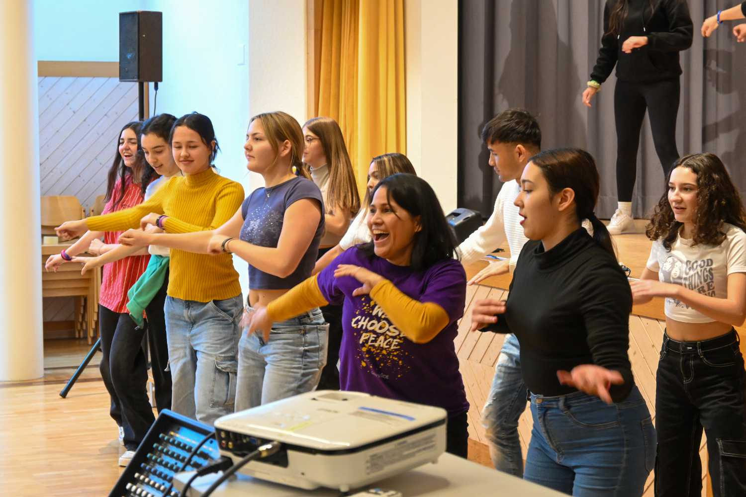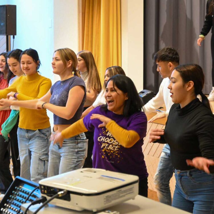 Der Beginn war mit allen im grossen Saal, die Moderatorinnen stellten sich vor und das Motto für den Samstag, „We choose peace!“ wurde vorgestellt. Danach verstreuten sich die Jugendlichen in die verschiedenen Workshops. Es wurde zusammen gesungen, getanzt, Theater gespielt und Perkussion gemacht. An der Performance am Sonntagnachmittag wurde einander das erprobte vorgetragen, das Publikum war begeistert von dem vielen Talent auf der Bühne. Die Mitglieder von Gen Verde holten das Beste aus den Jugendlichen heraus und man spürte die gute Atmosphäre, die die Gruppe während dem Wochenende prägte.
