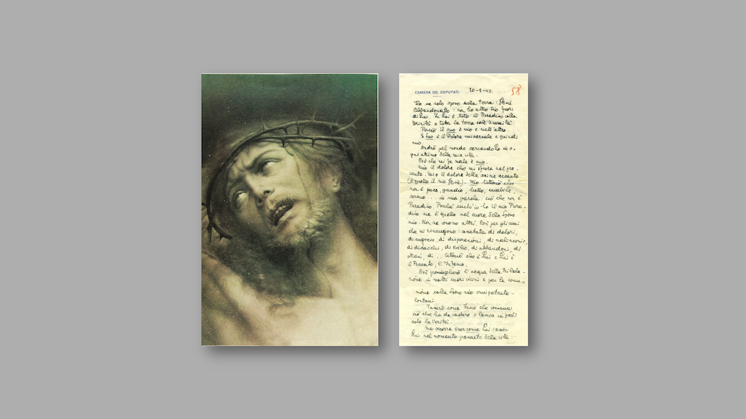 Und hier das Bild vom gekreuzigten und verlassenen Jesus, das Chiara in ihrem Zimmer hängen hatte, und ein Bild des Originaltextes von „Ich habe nur einen Bräutigam“: